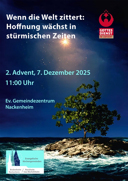 Gottesdienst am 2. Advent "Hoffnung in stürmischen Zeiten"Datum und Uhrzeit: Sonntag, 7. Dezember 2025 - 11:00 bis 12:00Ort: Ev. Gemeindezentrum NackenheimKontakt: Pfr'in Dagmar Diehl, Chris Lidy und TeamArtikelbild: Calendar / Kalender